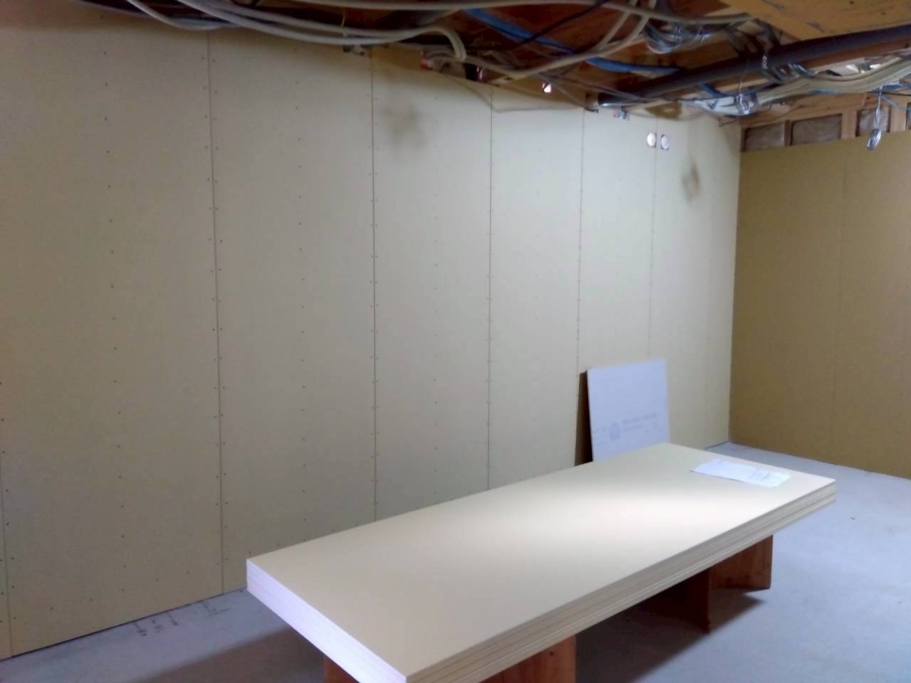 内部では、壁・天井の下地組みを行い、石膏ボード下地貼りが進んでいます。各診察室や待合スペースなど、クリニックとしての空間構成が少しずつ形になってきました。外部では外壁下地を設け、仕上げ工事に向けた準備を進めています。