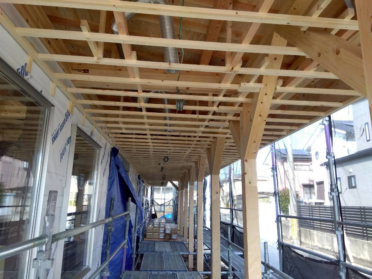 サッシの設置により建物の外観が整い、採光や通風計画もより具体的になってきました。気密性・断熱性にも配慮し、細部まで丁寧に施工を行っています。