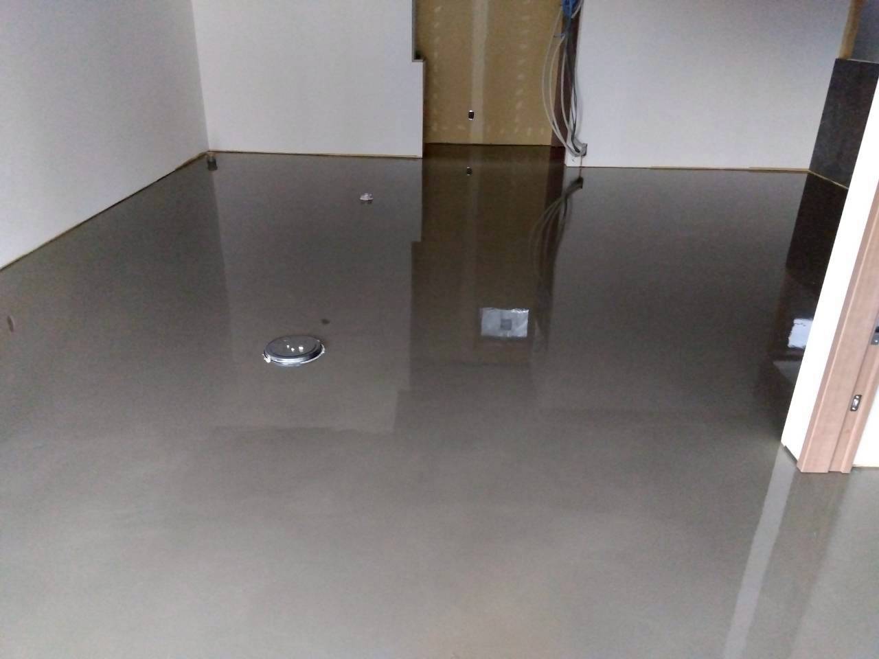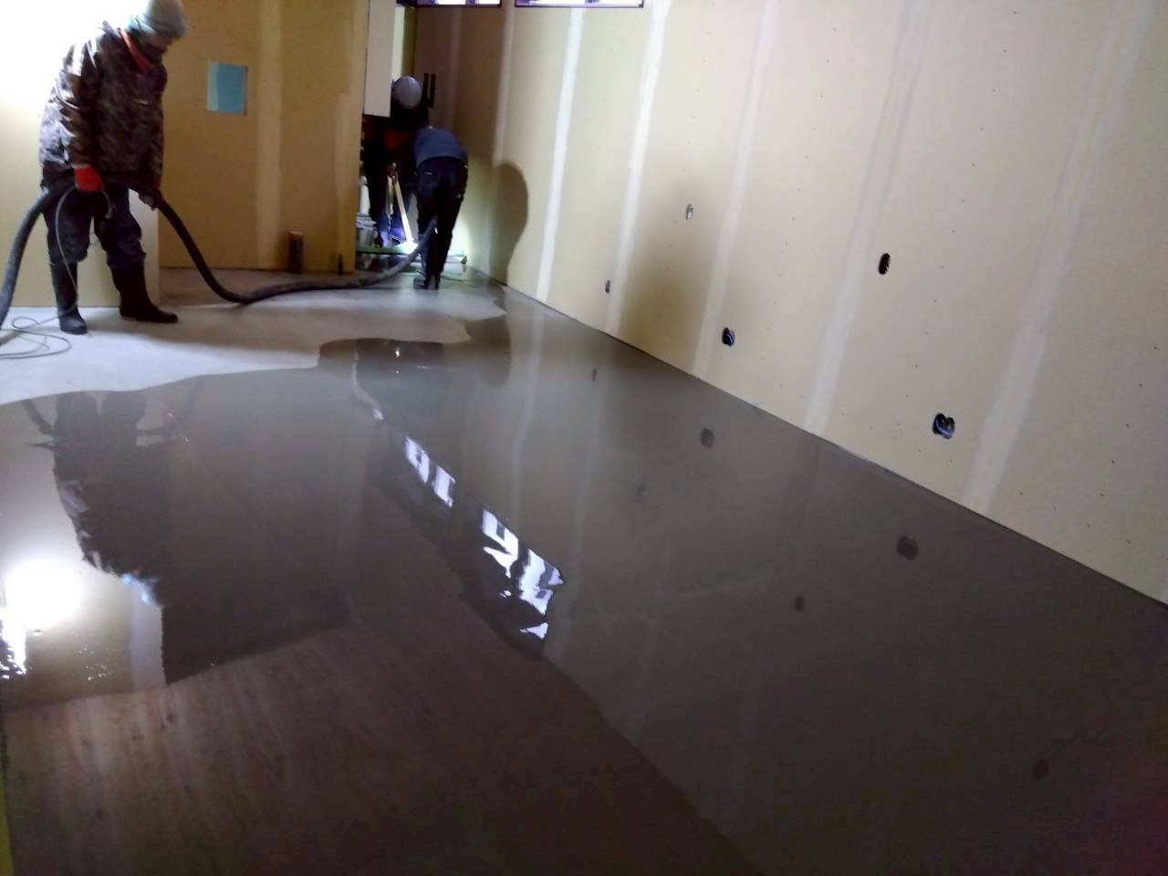床工事では、床を平らに整えるためにセルフレベリング工法を行いました。