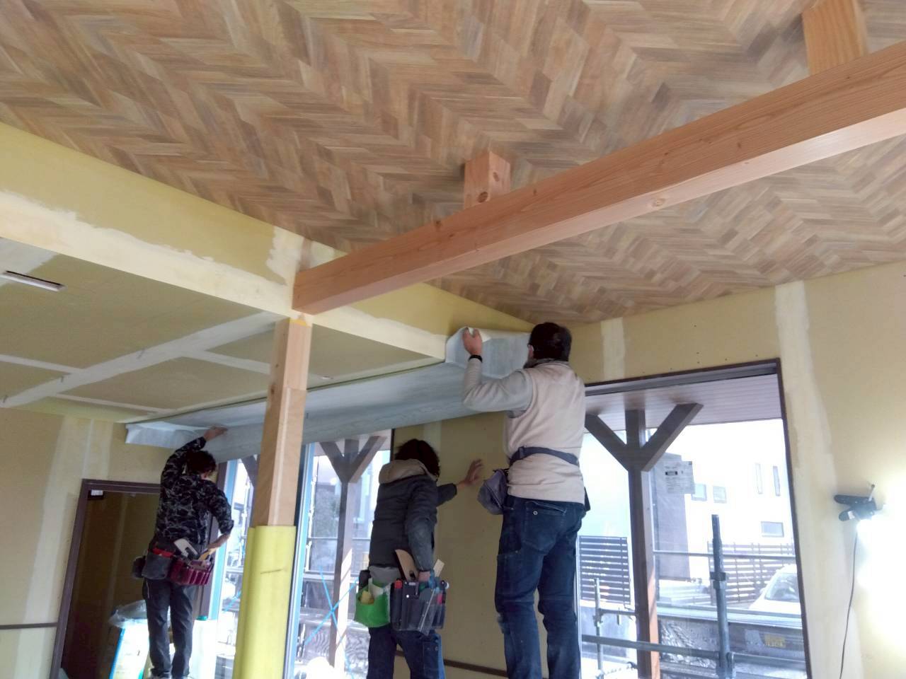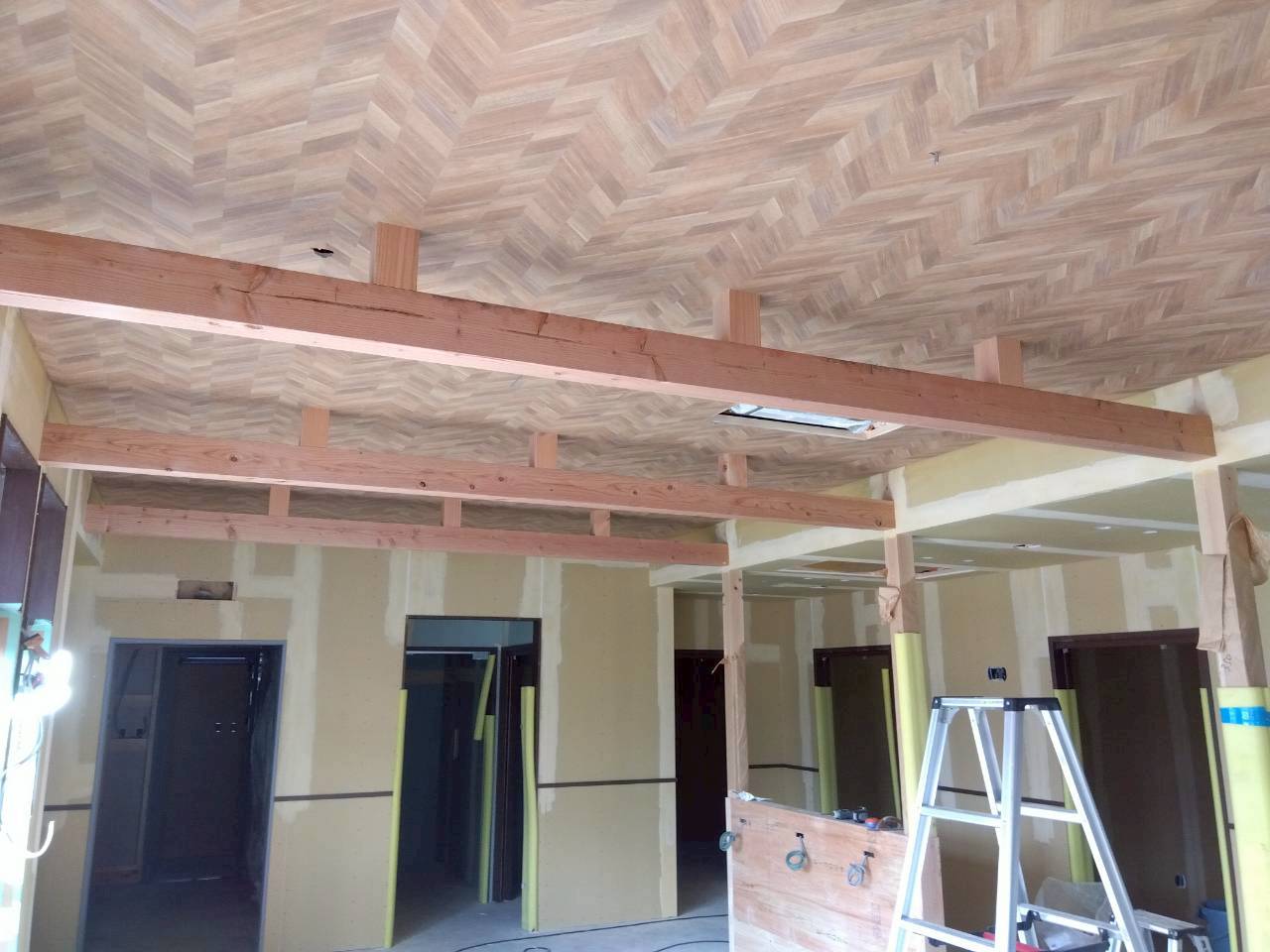 天井工事では、下地の施工が進み、室内の広さや明るさが感じられるようになってきました。照明や空調設備の位置も確認しながら、丁寧に作業を行っています。