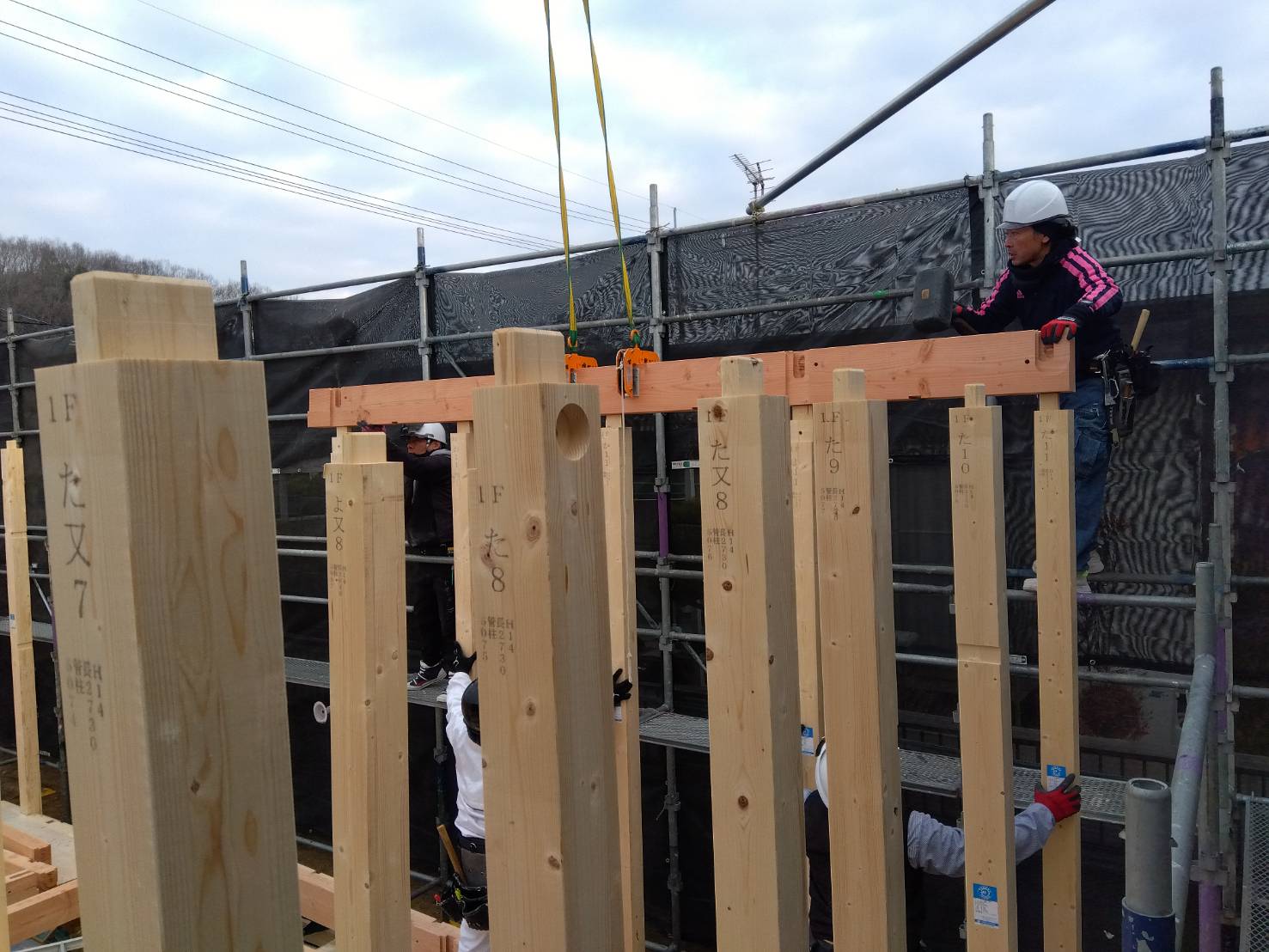 これまで進めてきた基礎工事・土台据えを経て、柱や梁を組み上げ、建物の骨組みが一気に立ち上がる節目の工程です。