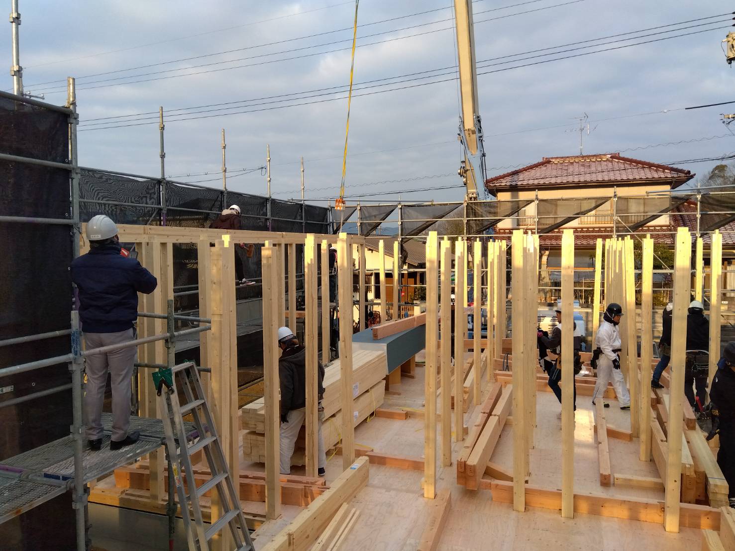 平屋住宅ならではの安定した構造のもと、職人同士が連携しながら、一本一本の柱や梁を丁寧に組み上げていきました。